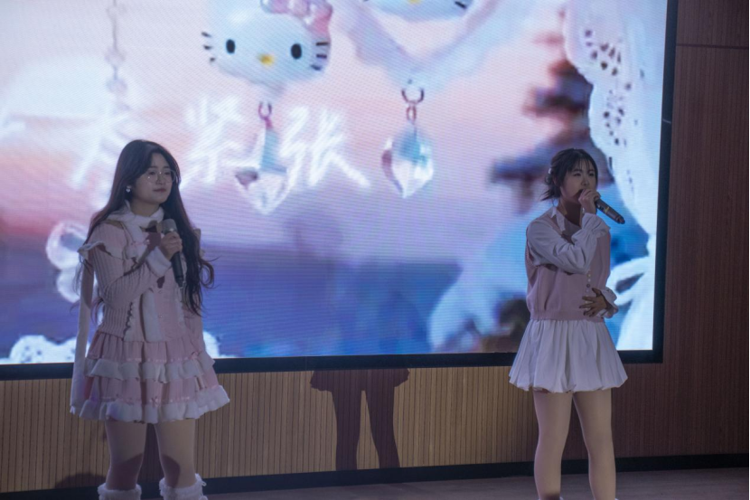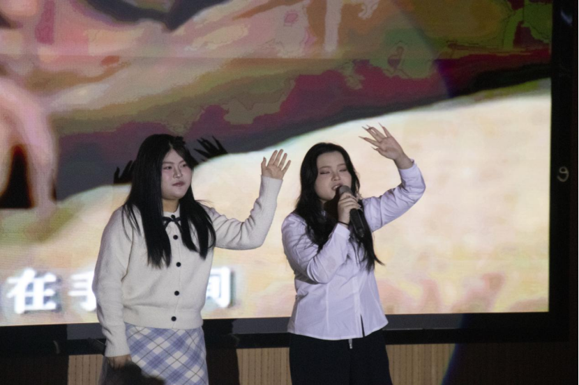 《爱的回归线》一响起,甜蜜的旋律瞬间把现场变成了粉色的梦境。李思瑶、李思璇同学用轻快的节奏、清甜的声线,把爱情里的期待与辗转唱得恰到好处,不少同学也跟着节拍哼唱起来。