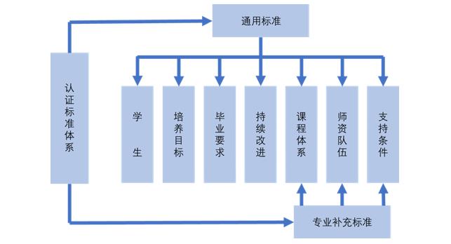 其中,通用标准规定了专业在“学生”、“培养目标”、“毕业要求”“持续改进”、“课程体系”、“师资队伍”和“支持条件”等七个方面的要求;专业补充标准在“课程体系”、“师资队伍”和“支持条件”等三个方面规定了相应专业类的特殊要求。