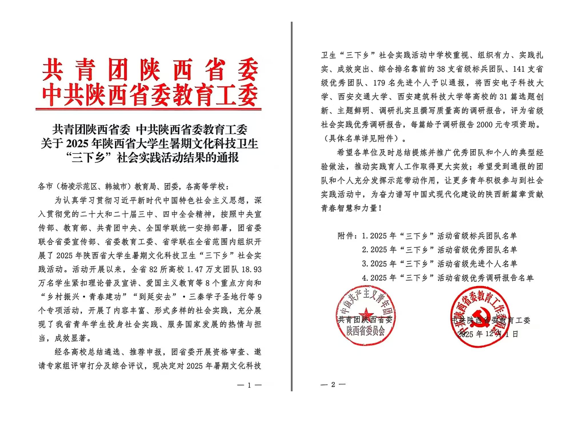 其中“承武侯遗风传定军文脉”一一勉县非遗薪火传习实践队与“影篾裁红塑华韵,青衿耘乡传非遗”实践队获得2025年“三下乡”省级优秀团队,苟颖、胡靖洁荣获2025年“三下乡”活动省级先进个人称号。