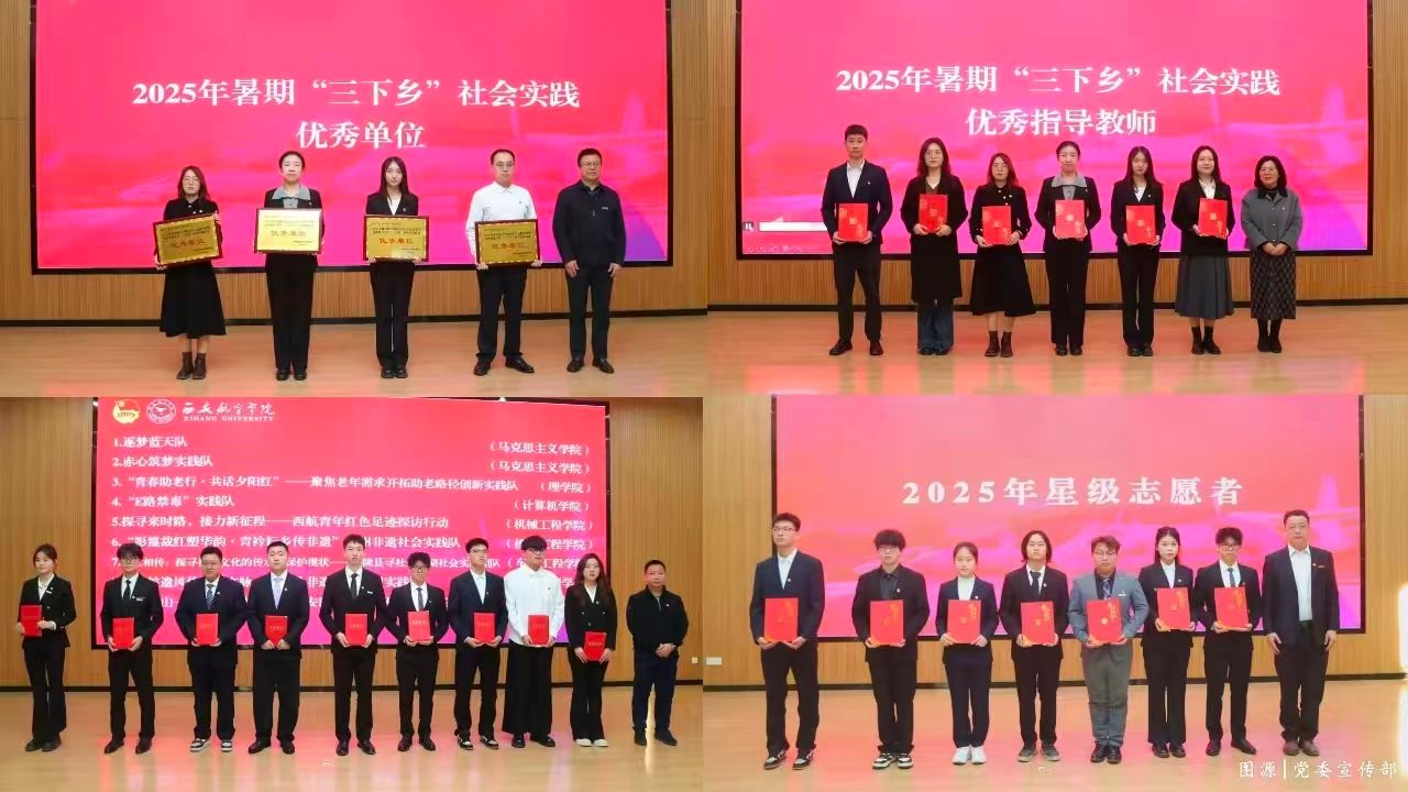 12月5日,学校于阎良校区报告厅举行“青春为中国式现代化挺膺担当”2025年大学生暑期“三下乡”社会实践与志愿服务工作总结表彰大会,十大买球官方网站团总支荣获暑期“三下乡”社会实践优秀单位,学院的三支队伍“探寻来时路,接力新征程——西航青年红色足迹探访行动” “‘影篾裁红塑华韵•青衿耘乡传非遗’社会实践队”“承武侯遗风传定军文脉——勉县非遗薪火传习实践队”三支队伍荣获暑期“三下乡”社会实践优秀团队,王嘉雨、王鹏博、胡靖洁、苟颖、成航荣获暑期“三下乡”社会实践优秀指导老师,刘晋锟荣获2025年三星级志愿者。