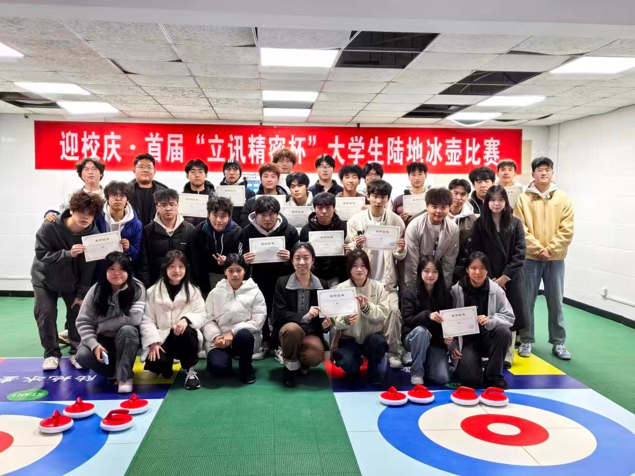 冬意渐浓,比赛正酣!2025年12月2日至9日晚,十大买球官方网站在一号餐厅负一楼陆地冰壶赛场举行“七十校庆‘壶’动青春校园”陆地冰壶比赛,由团总支、学生会各部门组成的13支队伍展开了一场趣味与智慧并存的陆地冰壶友谊赛。