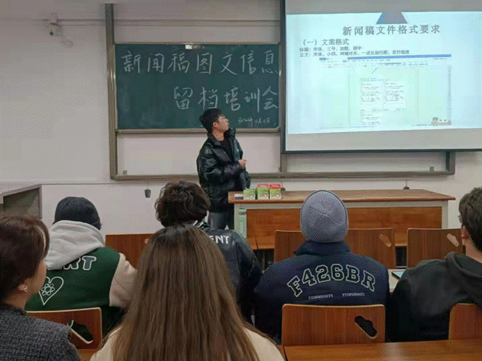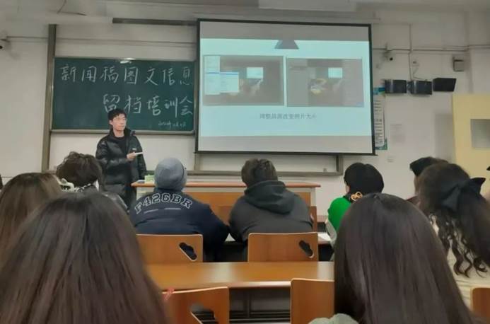 会上,刘笑雨为大家讲解了文案写作时需要注意的问题,包括:文案格式、照片比例、格式等;告知大家要注重新闻稿的质量,讲述了如何将新闻稿更好留档等内容。团总支第一副书记陈绪强调文案时效性、准确性,从自身经验给大家提出一些建议。