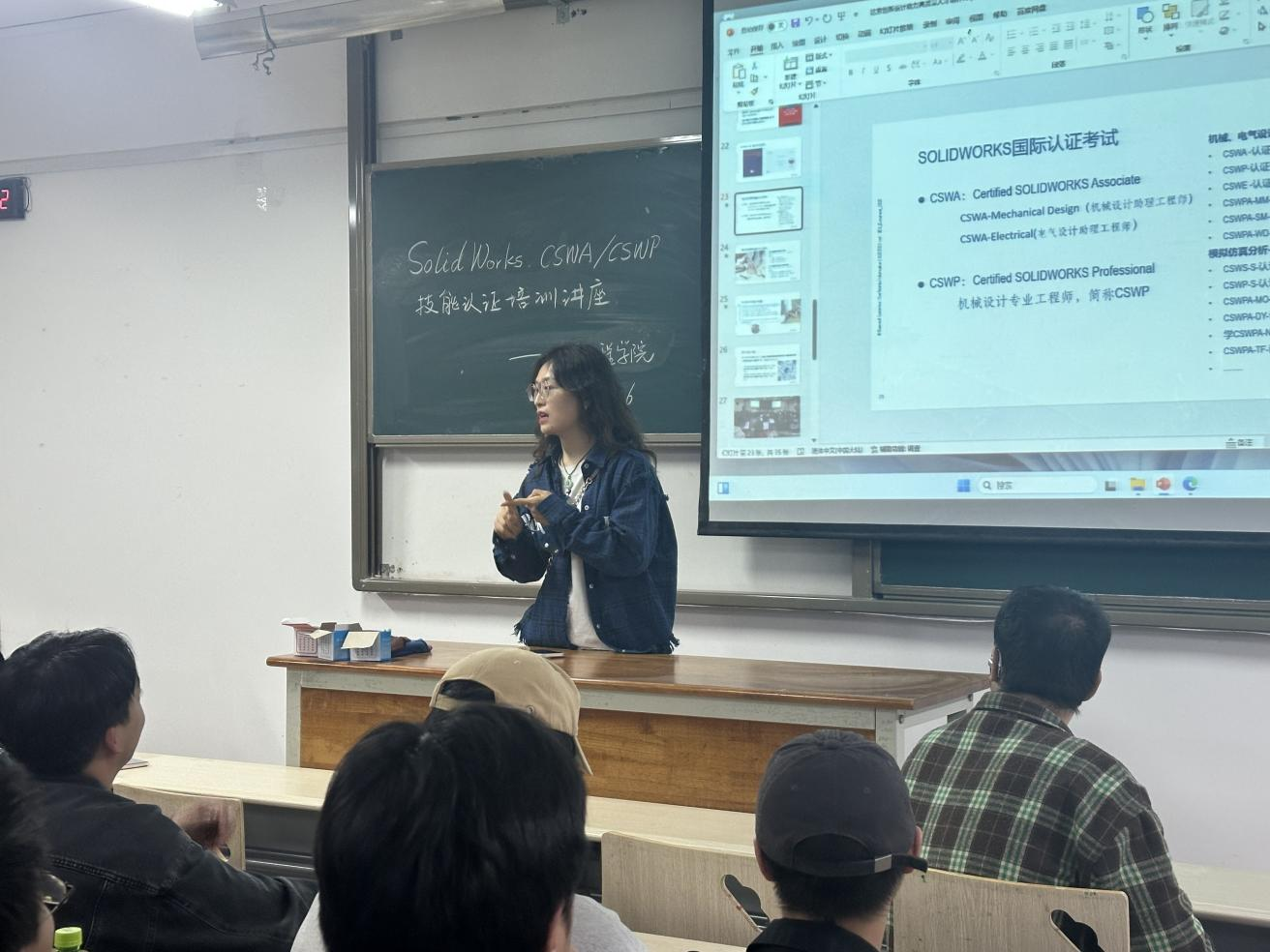 在讲座中,主讲人陈阳深入浅出地讲解了SOLIDWORKS CSWA/CSWP认证考试的重要性,并用视频、互动提问相结合的方式,为同学们解答什么是SOLIDWORKS以及获得技能认证的优势。除此之外,还通过分享她在实际工作中的应用案例,让同学们切实感受到SOLIDWORKS CSWA/CSWP技能认证不仅能够增强就业竞争力,而且可以为未来职业发展打开更多可能性。