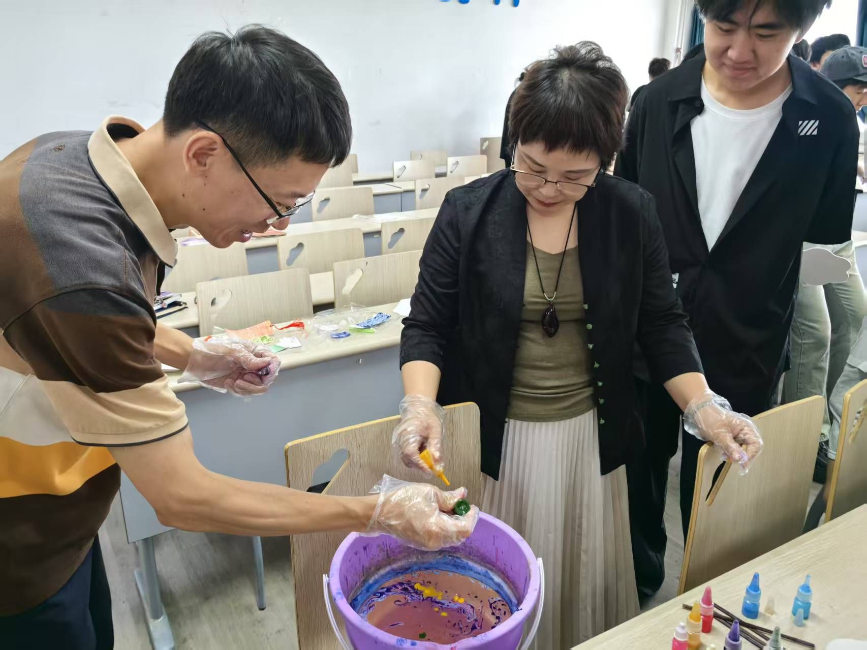 十大买球孙书记和刘书记也加入到了创作的队伍中,他们拿起漆瓶,往桶中滴入各色大漆,搅拌出想要的图案,最终制作出色彩绚丽的漆扇。十大买球辅导员胡老师也一同参与其中,与学生们一起在扇面上染出美丽的图案。